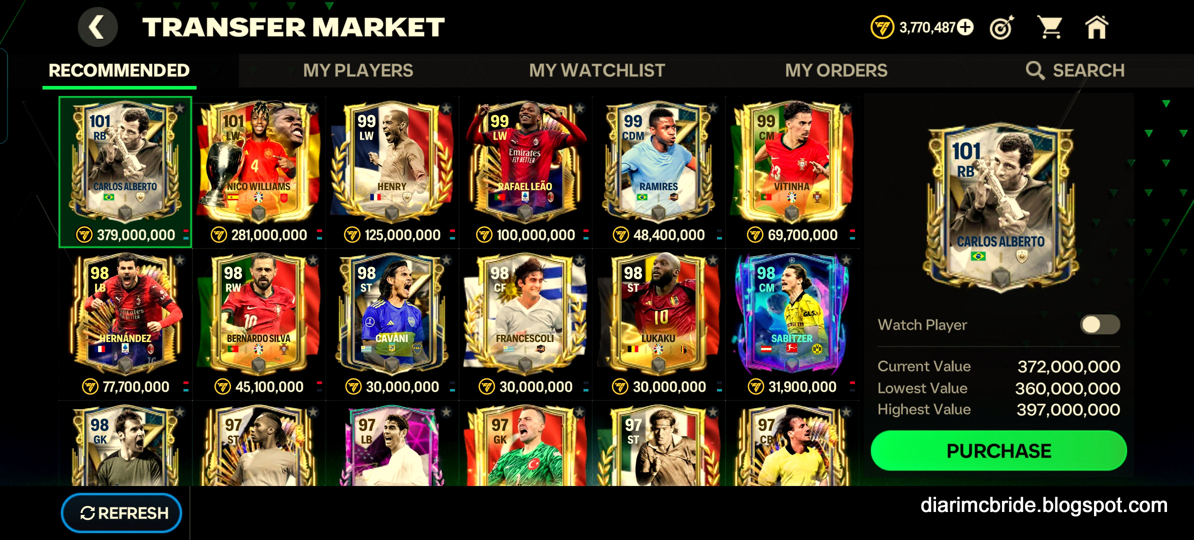 Ni pulak Transfers. Kat sini lah tempat you all nak beli dan jual player. Nak beli pakai apa? Mestilah pakai Coin. Harga player based on their card. Kekadang satu player tu ada a number of card depending on their level. Lagi tinggi level, lagi mahal lah harga diorang. For example, basic Joelinton's card berharga 90,000 sahaja but fully upgraded Joelinton's card boleh menjangkau ke 24,000,000. It will surely take time lah untuk beli card yang berkualiti.